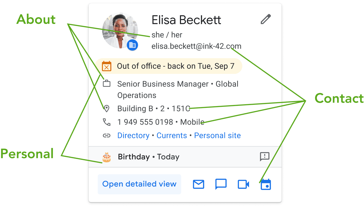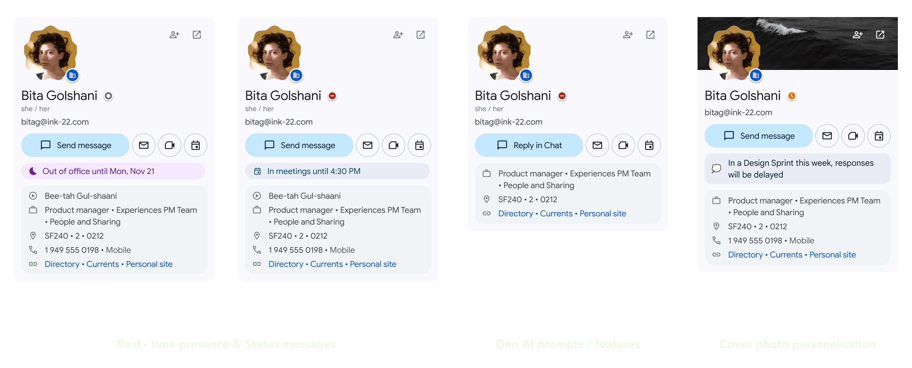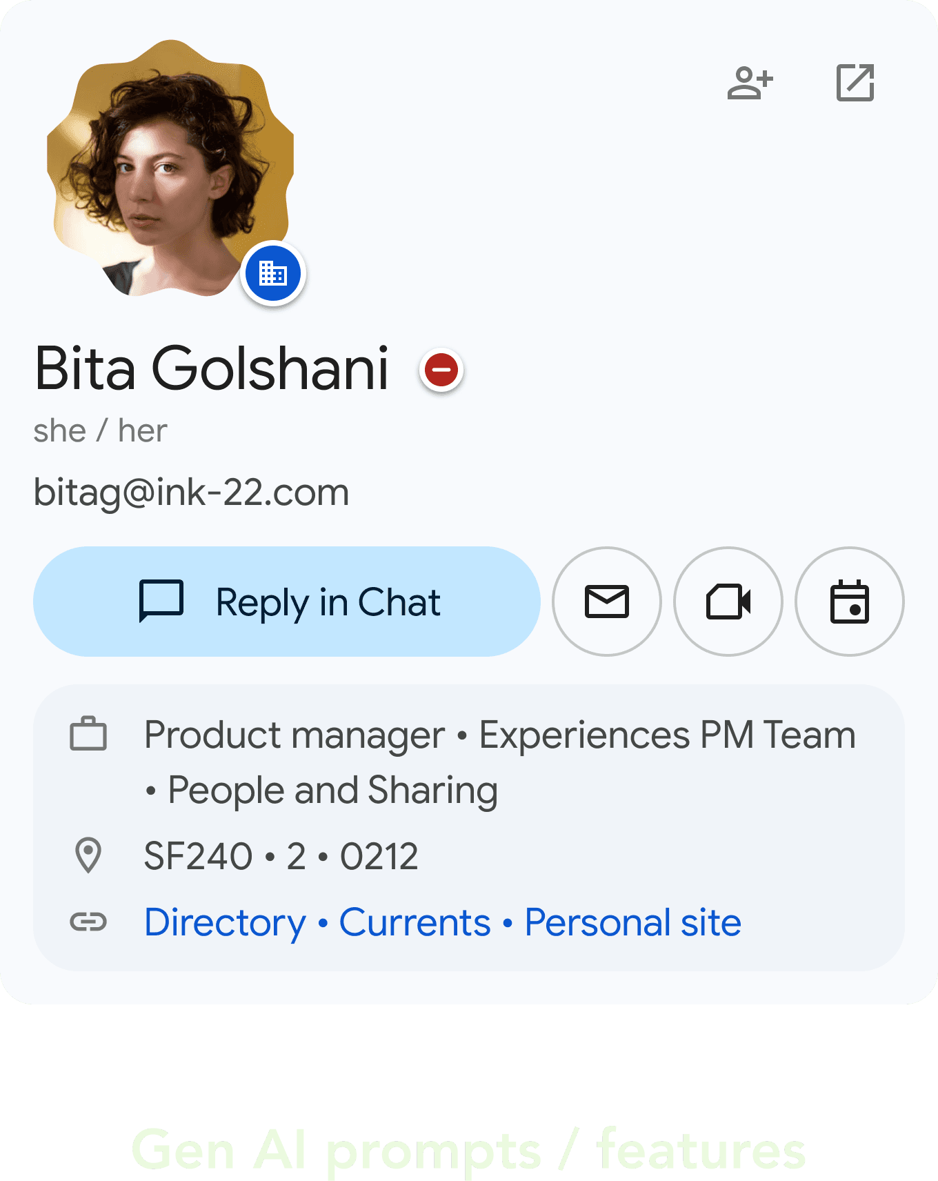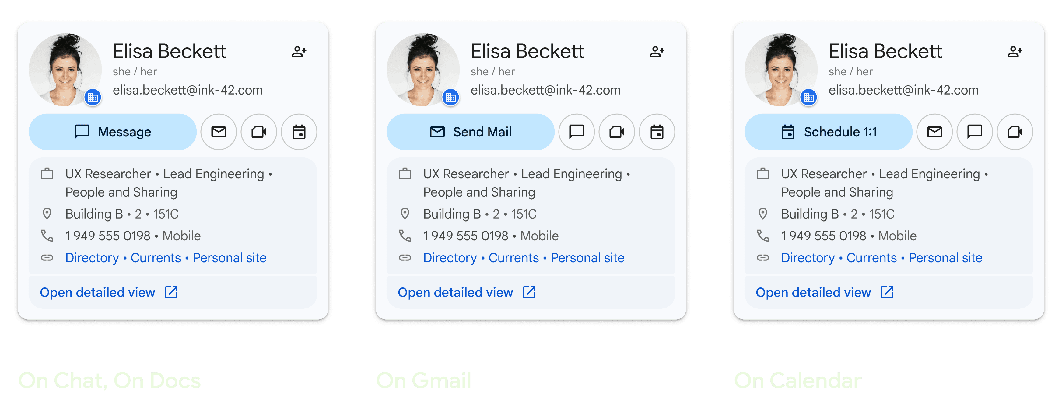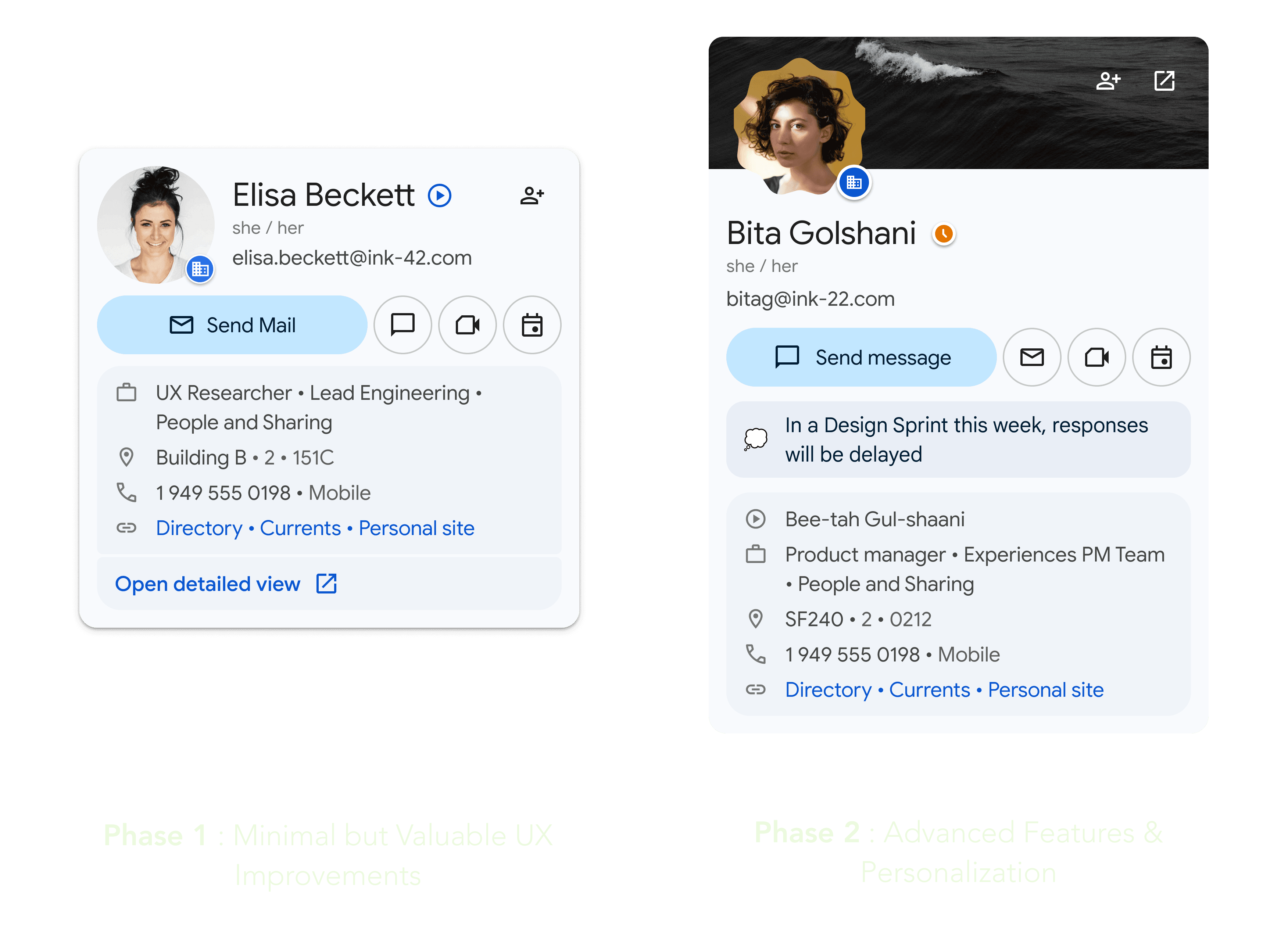I led the end-to-end redesign of Gmail’s People Card : A hover UI component surfaced across Gmail, Chat, Calendar, and other Google Workspace products. It gives users quick, glanceable info about a person. It is available for both Enterprise and Consumer users.